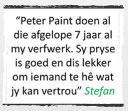 is a professional paint contractor that has been operating in the Western Cape area for many years. Our focus is on residential properties, bussinesses, schools and churches. The owner Simelo Peter's vision is to provide an all inclusive reliable painting service to home and business owners offering excellent finishes at the best price. Why not try our QUOTE CALCULATOR for a no obligation online paint quote? We are the first company in South Africa to provide online paint quotes! All quotations are free of charge and once accepted, a supervised team of trained specialists will soon transform your home or business. A host of the projects that we have completed can be viewed from our HOME page.